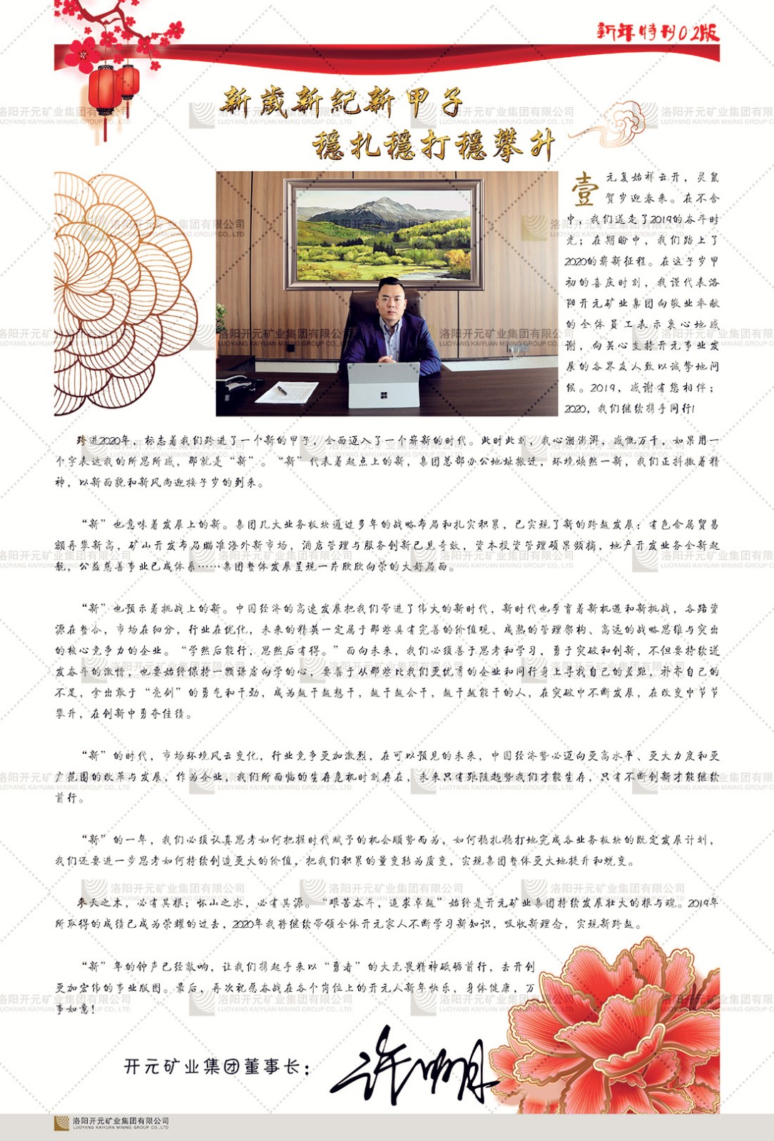 洛陽開元礦業(yè)集團(tuán)有限公司簡介洛陽開元礦業(yè)集團(tuán)有限公司,始成立于2006年,位于洛陽市開元大道269號。集團(tuán)旗下共有五余家全資子公司,業(yè)務(wù)涉及有色金屬礦山開發(fā)、礦產(chǎn)品購銷與進(jìn)出口貿(mào)易、房地產(chǎn)開發(fā)、文化藝術(shù)、企業(yè)管理與咨詢、資本投資等多個領(lǐng)域。民建河南省委委員、民建河南省委企業(yè)委副主任、民建洛陽市委委員、企業(yè)委主任、洛陽民建企業(yè)家協(xié)會會長許明月是公司創(chuàng)始人,現(xiàn)任洛陽開元礦業(yè)集團(tuán)有限公司董事長。在礦業(yè)領(lǐng)域,洛陽開元礦業(yè)集團(tuán)擁有多家實(shí)力雄厚的子公司:貴州開元礦業(yè)有限公司探、采礦權(quán)面積共11.33平方公里;興??h銅鑫礦業(yè)有限公司探礦權(quán)面積8.76平方公里,礦山資源潛力巨大;2021年,開元集團(tuán)與盧氏中科礦業(yè)有限公司開展戰(zhàn)略合作。盧氏中科礦業(yè)有限公司專注于有色金屬的浮選、加工和銷售,擁有強(qiáng)大的技術(shù)支撐平臺,是集探、采、選、冶、研為一體的中大型綜合礦業(yè)企業(yè)。目前,盧氏中科王家河1000噸選礦廠已成功投產(chǎn),雙河金礦、柳關(guān)欒盧鉛鋅礦相繼順利開工,樓房銀礦與圪老灣鉛鋅礦的深部探礦重大突破,標(biāo)志著礦山版圖取得重大進(jìn)展,為開元集團(tuán)后續(xù)發(fā)展奠定了堅實(shí)基礎(chǔ)。在文化傳媒領(lǐng)域,洛陽市明月美術(shù)館通過豐富多樣的藝術(shù)展覽、學(xué)術(shù)研討和公共教育活動,努力打造一個集展覽、交流、教育、研究為一體的綜合性藝術(shù)平臺。此外,在金融投資領(lǐng)域,開元集團(tuán)旗下的北京明峰資本管理有限公司專注于投資具有高增長潛力的優(yōu)秀企業(yè),特別是高科技、新能源、環(huán)保等新興產(chǎn)業(yè),為客戶提供個性化的資產(chǎn)配置服務(wù)。在做好企業(yè)經(jīng)營的同時,開元集團(tuán)始終不忘企業(yè)的社會責(zé)任和家國情懷,以突出的愛心公益事跡,開展了一系列公益慈善活動:“民建林”公益事業(yè)通過“思源基金”“幫幫公益”線上公益平臺,與眾多愛心人士籌措資金20余萬元;資助541名貧困大學(xué)生共計270余萬元,推進(jìn)“數(shù)字助力——河南AI人才培養(yǎng)”;捐款10萬元,馳援京津冀、黑龍江洪水地質(zhì)災(zāi)害……公司于2017年底被洛陽市慈善總會評為“洛陽慈善風(fēng)云榜——十大愛心集體”。洛陽開元礦業(yè)集團(tuán)有限公司秉承持續(xù)發(fā)展理念,憑借多年來良好的企業(yè)信譽(yù)與經(jīng)營業(yè)績,與全國多家企業(yè)建立了良好合作關(guān)系,受到社會各界的一致好評,多次榮獲“納稅標(biāo)兵”“先進(jìn)企業(yè)”“招商引資模范企業(yè)”等榮譽(yù)稱號?;赝麃頃r路,開元人勠力同心,以“闖”的精神和“創(chuàng)”的勁頭,一路披荊斬棘,踏過千山萬水;展望新未來,開元人凝心聚力,不執(zhí)于“舊”,無畏于“新”,秉承“勇于跨越,追求卓越”的企業(yè)精神,乘著國家高質(zhì)量發(fā)展新征程的東風(fēng),跨過高山,越過大海,向著集團(tuán)多元化、國際化的目標(biāo),逐夢遠(yuǎn)航,跨越前行!